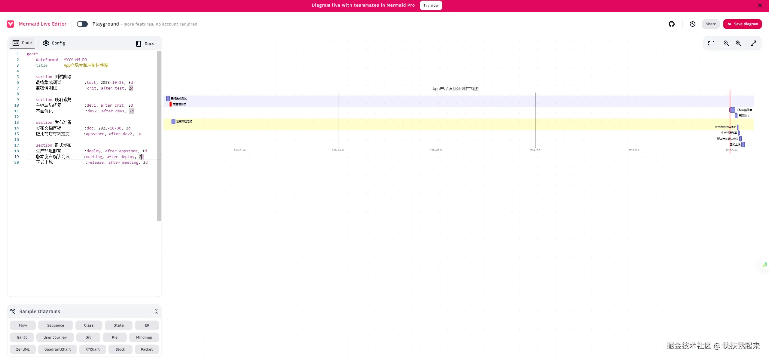 2、将代码复制到 mermaid 编辑器中渲染,会得到甘特图。