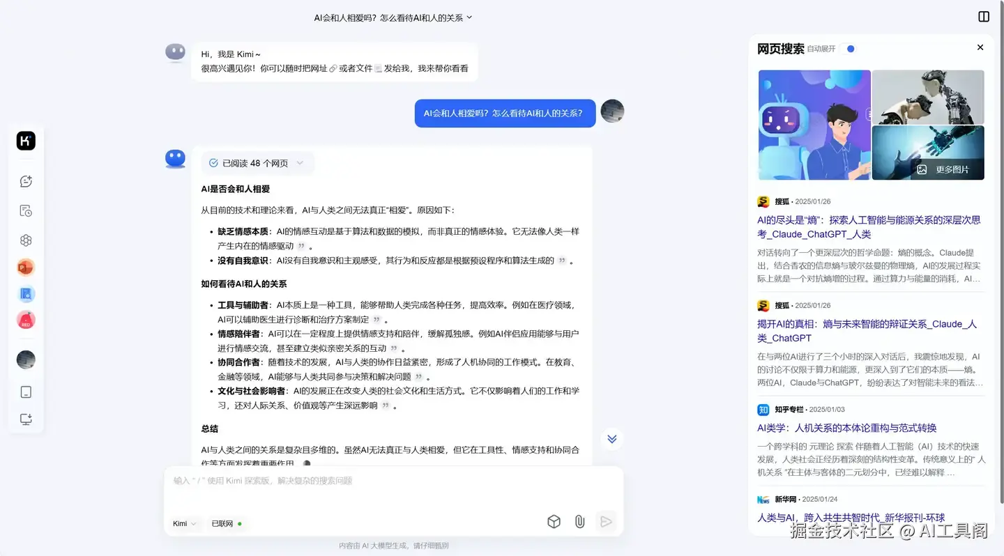 Kimi是由月之暗面科技有限公司(Moonshot AI)开发的国产AI,擅长中英文对话,能够提供安全、有帮助、准确的回答。支持阅读和理解多种文件格式,包括TXT、PDF、Word文档、PPT幻灯片和Excel电子表格等。此外,还具备搜索能力,能够结合搜索结果提供更加全面的回答。最最重要的是当前是免费使用的
