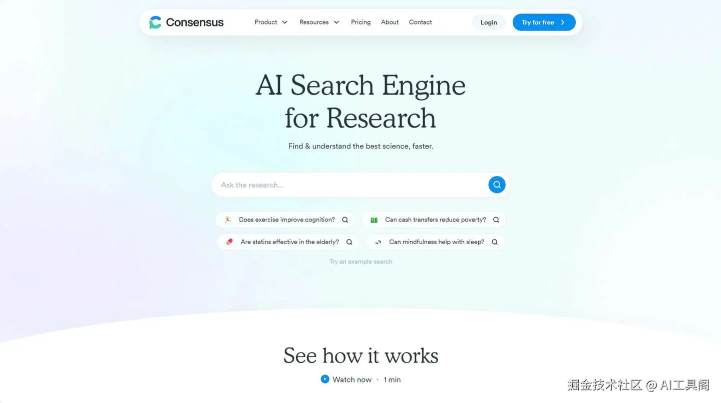 Consensus是一款基于人工智能的学术搜索引擎,专注于从超过2亿篇同行评审的科学论文中提炼可靠结论。它结合自然语言处理技术与专业文献数据库,帮助用户快速获取研究支持的答案,避免传统搜索引擎的虚假信息干扰,为学术研究、医疗决策、教育及内容创作提供精准的学术依据。