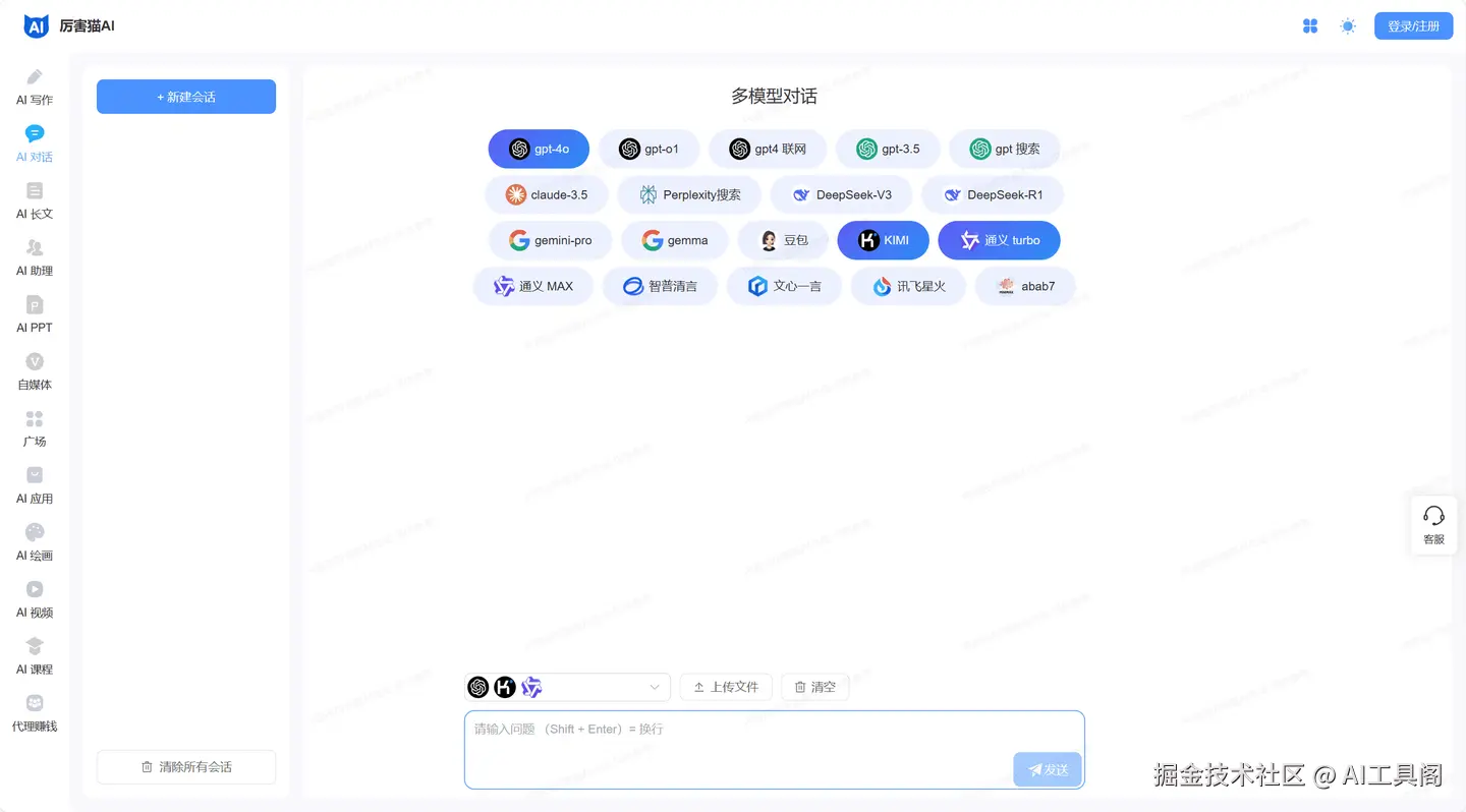 AIGC平台,对接了厉害猫AI、GPT3.5、GPT4O、通义千问、Kimi、文心一言、讯飞星火、智谱清言、ChatGLM9个大模型
