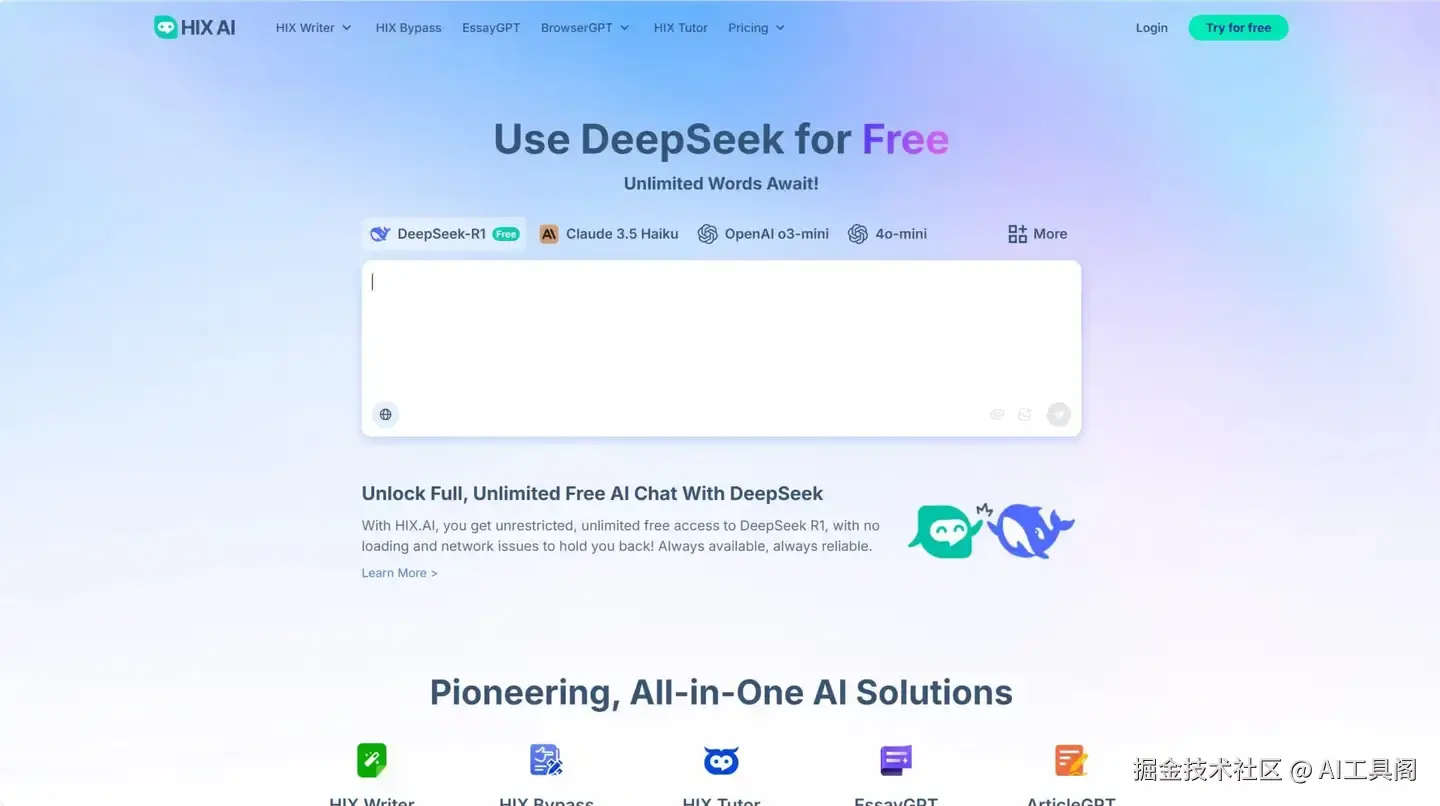 Hix AI是一款基于人工智能技术开发的智能写作工具,旨在帮助用户高效生成符合需求的高质量文本内容。通过深度学习和自然语言处理技术,它能够理解用户意图并快速输出结构清晰、逻辑严谨的文字,覆盖从创意发想到成品优化的全流程需求,支持满血Deepseek R1、ChatGPT4o等模型。