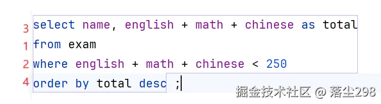 select id ,name, math + chinese + english as '总分' from exam order by math + chinese + english desc;