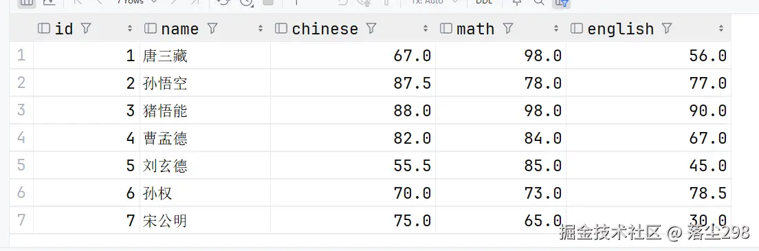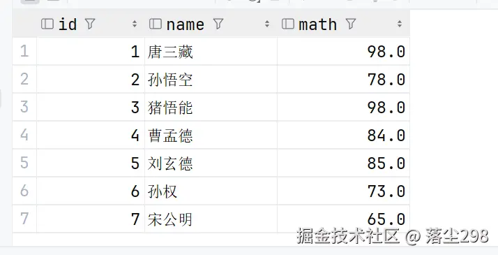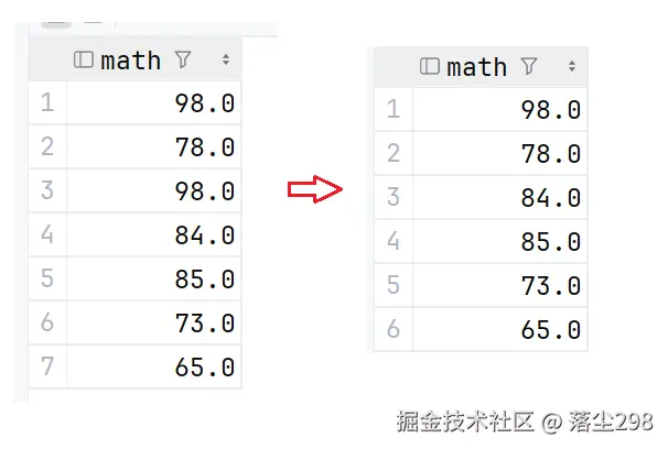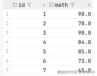 去重查询是通过关键字 distinct 来实现的,在之前的math中,是存在一个重复的98的,我们来试验一下去重查询操作: