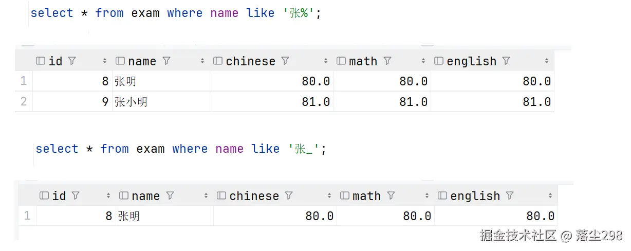 当用 '%' 表示的是找出姓张的人,任意字符也就是张后面可以跟任意个字符,'_' 表示单个字符,也就是张后面只能跟一个字符