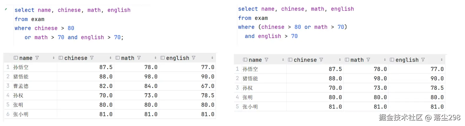where (chinese > 80 or math > 70)