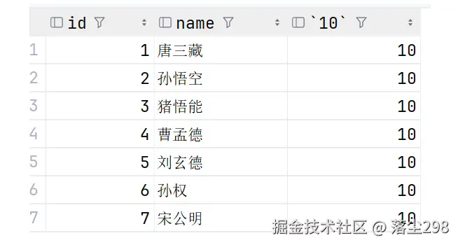select id ,name ,10 from exam;