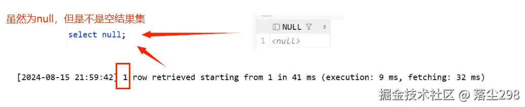 对于上面的SQL语句,虽然exists中返回的是 null ,但不是空结果集,所以还会执行外层查询