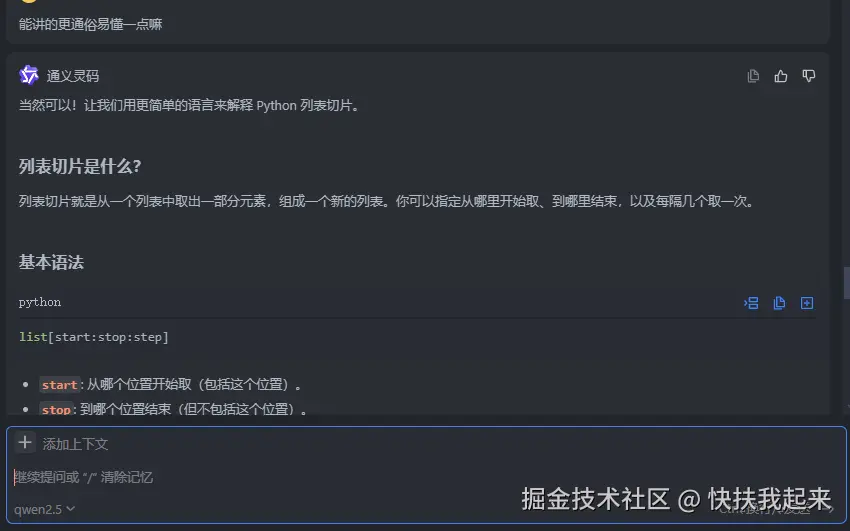 在学习过程中遇到不懂的问题,可以直接向通义灵码提问,它会给出详细的解答。