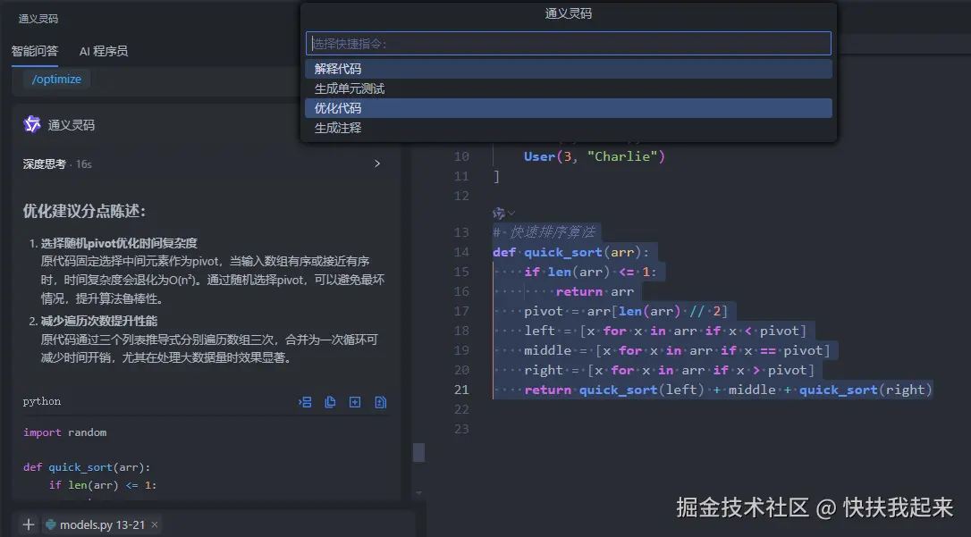 写完代码后,利用通义灵码的代码优化功能,找出代码中的不足并进行优化。
