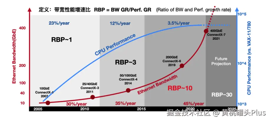 通常的,我们可以使用 RBP(Ratio of Bandwidth and Performance growth rate,带宽性能增速比)来定义网络带宽的增速比上 CPU 性能的增速,即:RBP=BW GR/Perf. GR。