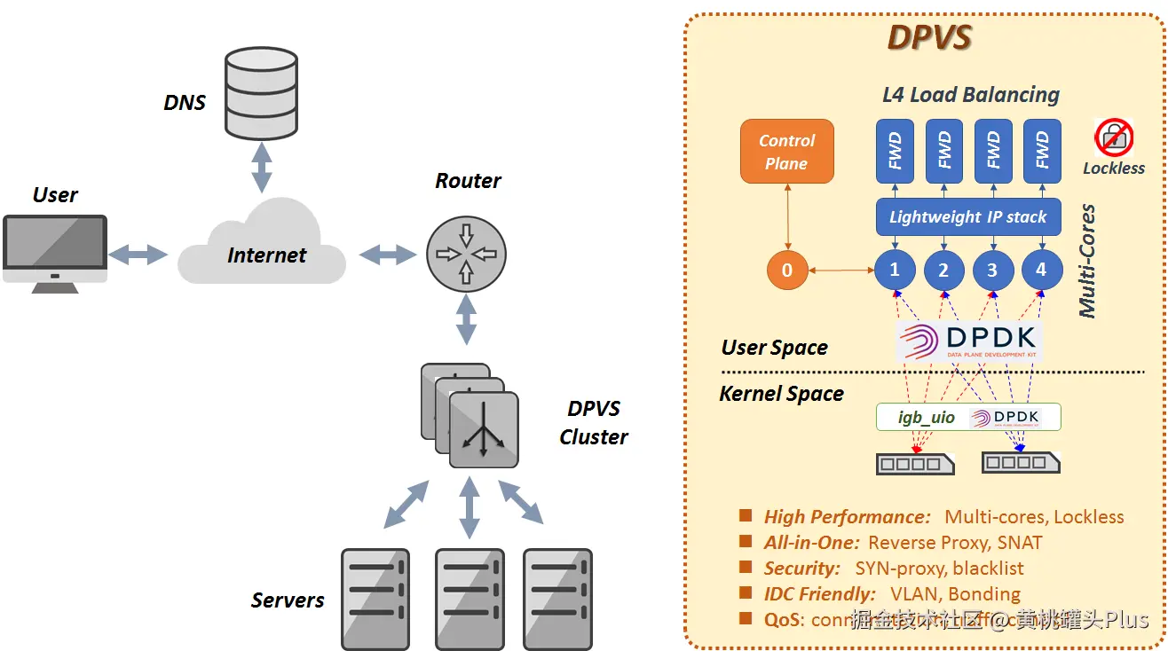 综上,由于 LVS 的数据面是一个 Linux Kernel Module(ipvs),其性能无法满足现代化需求,所以国内公司 iqiyi 基于 DPDK 开发了 DPVS。值得一提的是,由于 DPVS 项目由国内公司开源和维护,所以其开源社区对中文开发者也会更加友好。