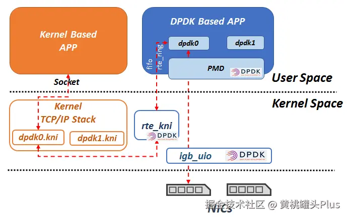 - 使用用户态协议栈代替内核协议栈:Kernel by-pass (user space implementation).