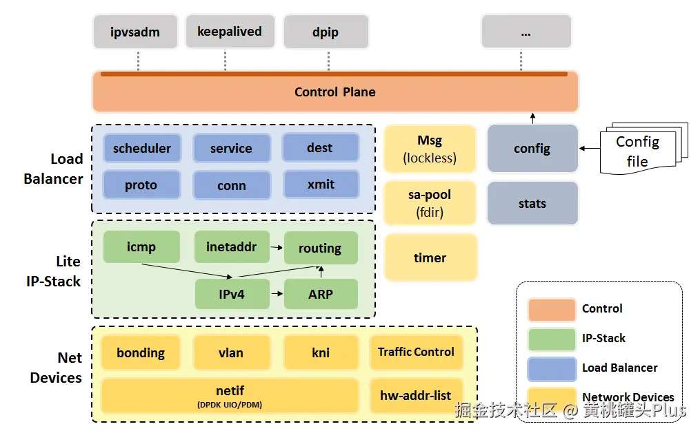 在软件架构方面,DPVS 沿用了数据分离架构和基于 Keepalived 的 Master-Backup 高可用架构。
