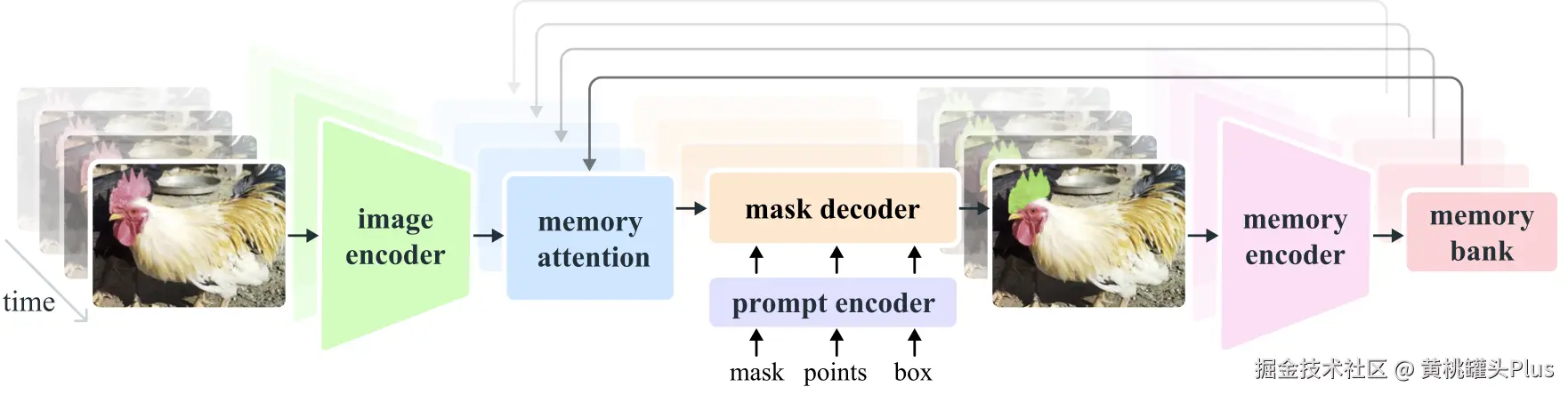 - 功能:记忆机制主要用于处理视频分割任务中的时间依赖性和物体遮挡问题。它通过存储过去帧的信息,帮助模型在当前帧中更好地理解物体的运动和变化,从而实现对物体的连续跟踪和准确分割。