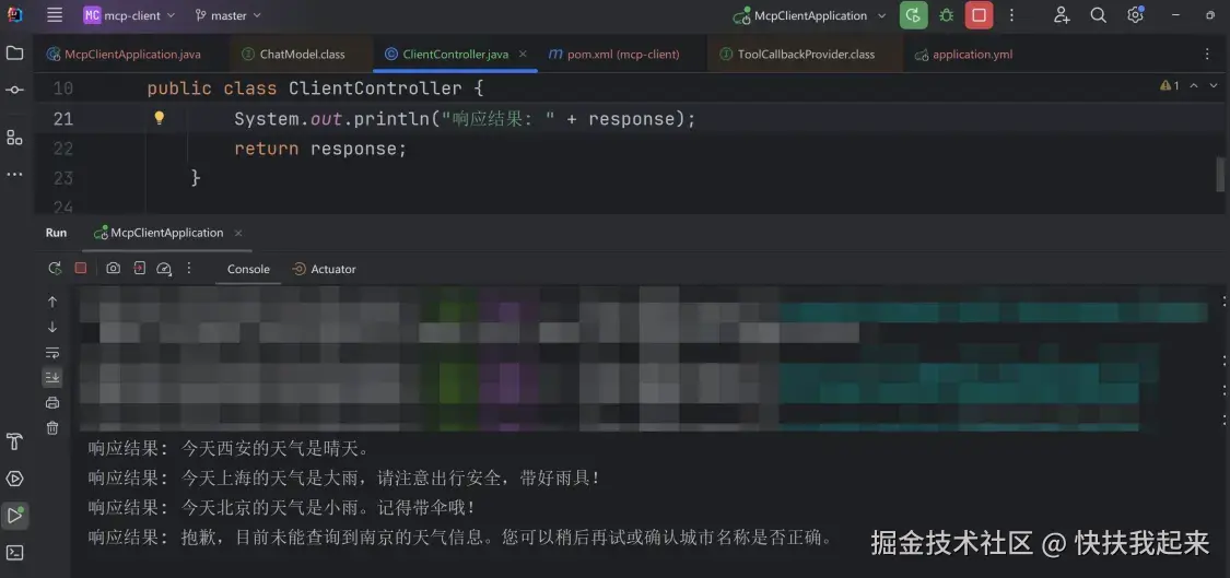 到这里使用 Spring AI 就实现了 MCP Client 和 Server 的调用了,可以看出 MCP 的推出只是为了增强大模型的能力的,有了 MCP 协议之后,任何大模型就可以调用任意实现了 MCP Server 的服务了,这样就无线扩充了大模型的能力,为 AI 的发展提供了标准的协议和便利的对接。