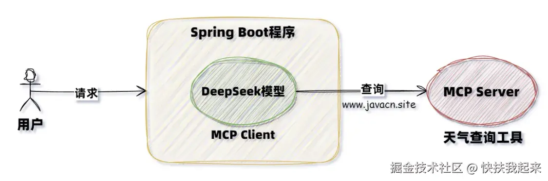 它可以通俗的理解为 Java 界的 Spring Cloud Openfeign,只不过 Openfeign 是用于微服务通讯的,而 MCP 用于大模型通讯的,但它们都是为了通讯获取某项数据的一种机制,如下图所示: