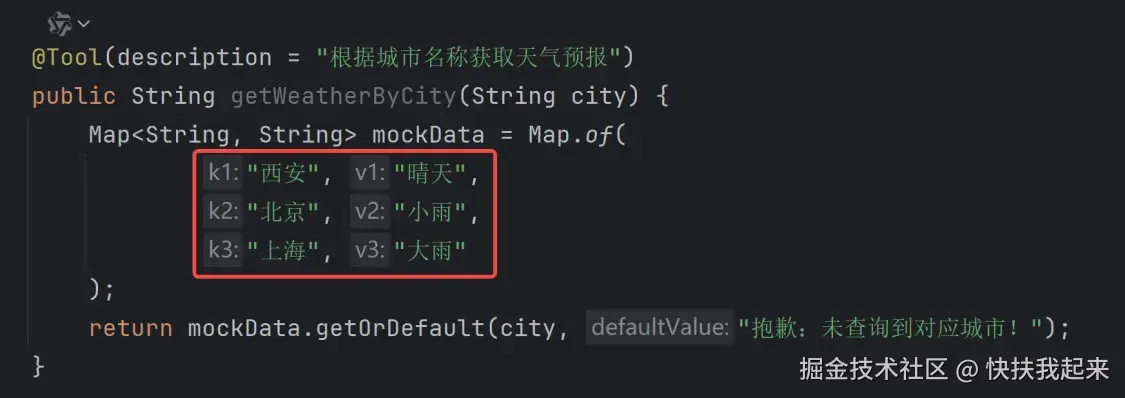 @Tool(description = "根据城市名称获取天气预报")