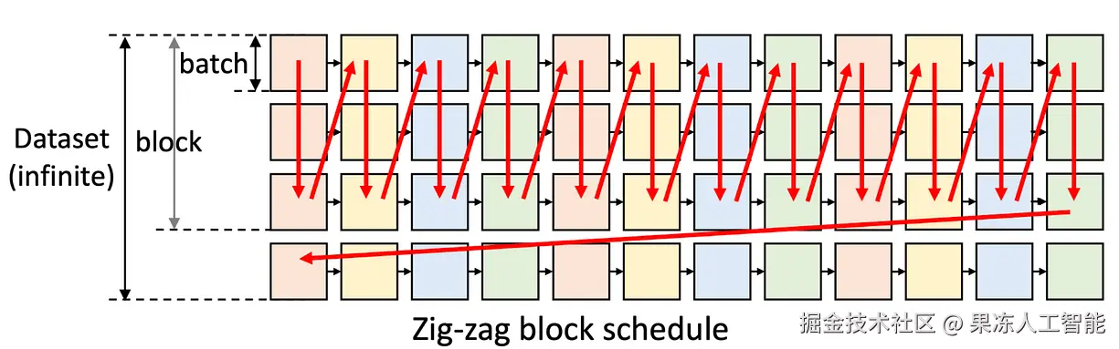 Flexgen 的优化点在于:不再按行或者列一块块计算,而是改为“Z字形块调度”。它不需要重复I/O就能保存层的权重,同时也保存了下一个列的激活。在执行过程中,Flexgen 会同时进行三个操作:加载下一层的权重、存储前一批的激活/KV缓存、计算当前这批数据。这种并行策略非常好地解决了内存传输瓶颈。