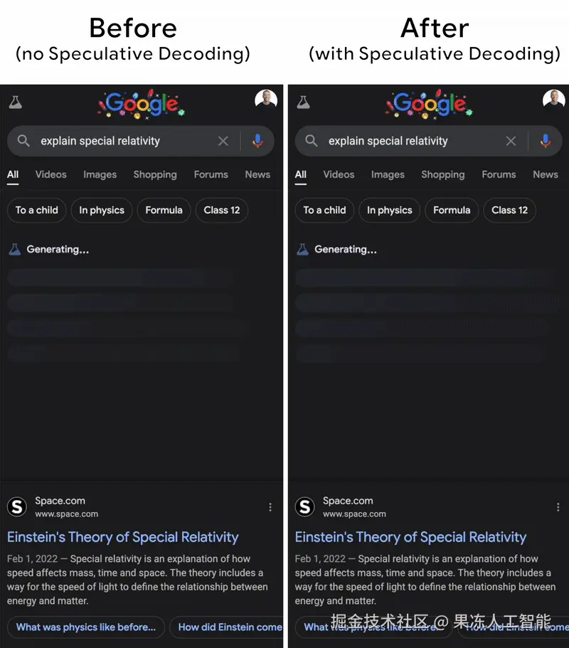 用两个模型虽然会多占内存,重复生成也浪费时间。但这方法实在太好用了,连Gemini都实现了它(见下图)。现实中,小模型常常猜得准得很,因为我们常见的词是“yes”“this”“is”这类的,小模型很容易就猜对了。所以相比逐个token解码,现在我们可以把草稿模型一次性猜的一批token,全交由大模型并行验证 —— 极大提升了速度。