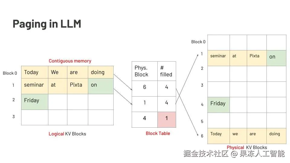 参考操作系统的内存管理思路,Page Attention机制把数据按逻辑块组织,用“页表”监控它们,然后映射到物理内存上。关键点如下: