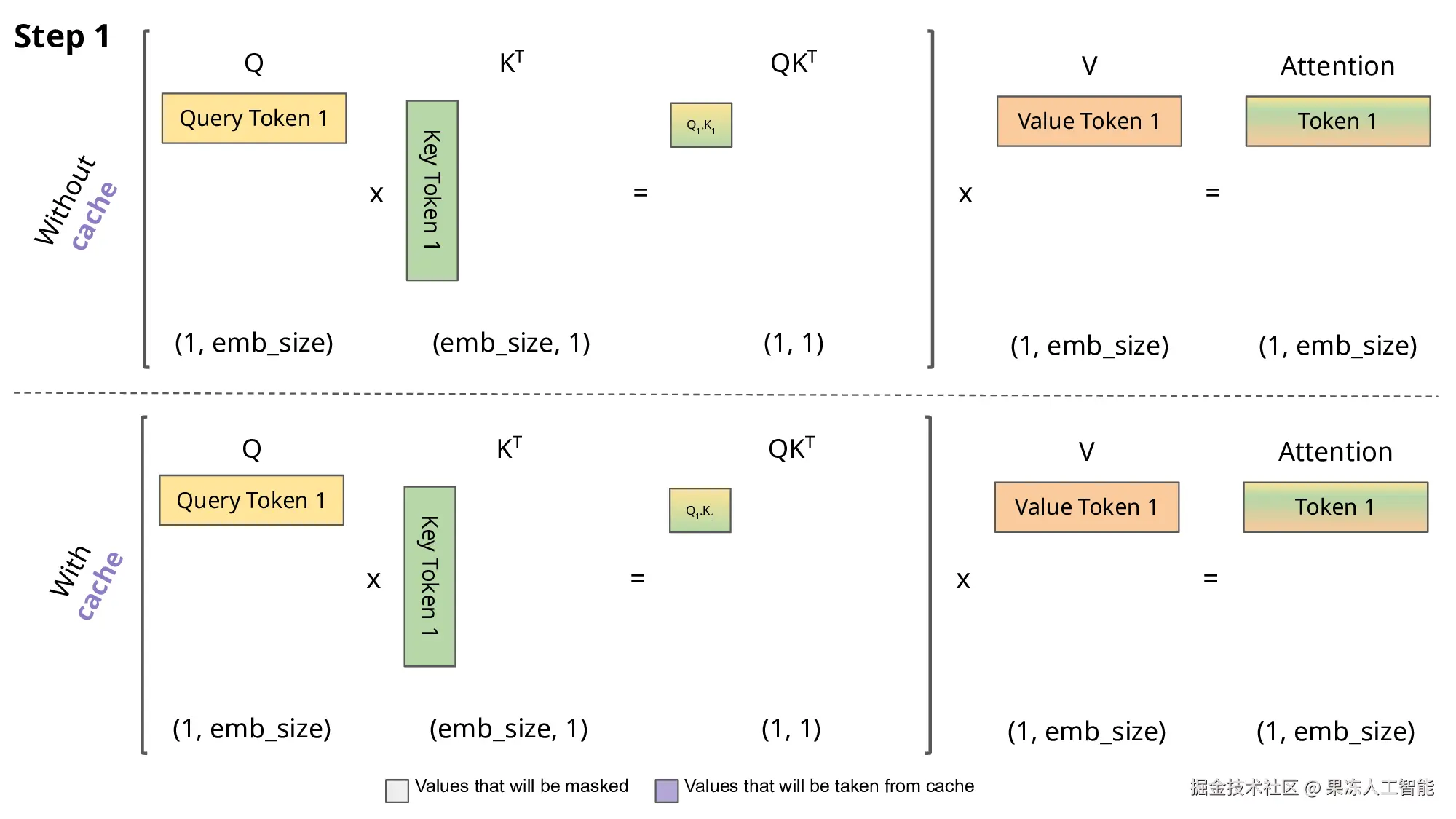 注意力计算覆盖整个序列,是LLM推理最核心也是最耗资源的操作。每次生成token时,它还要重复前面很多计算。Key-Value缓存就是帮你记住前面步骤里有用的信息。用KV cache,GPT2在T4 GPU上能加速5倍。下面图展示了有缓存和没缓存的区别。