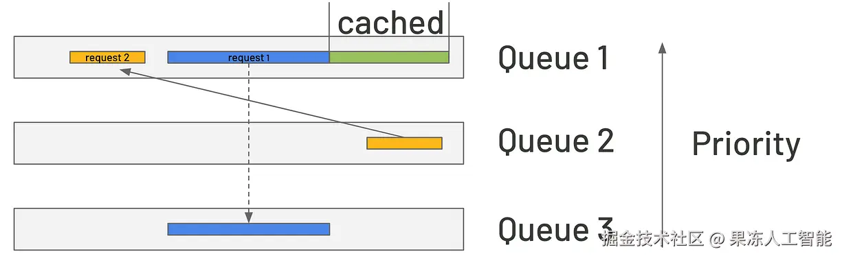 FastServe 的解决办法是引入 Skip-Join MLFQ(多级反馈队列) 。系统接到请求时,先估算出生成第一个token所需的时间,再把请求路由到合适的优先级队列,这样就不会干扰短请求。而且,KV缓存机制可以在GPU还没处理上一个请求时就提前准备好下一个请求的数据,进一步减少延迟。