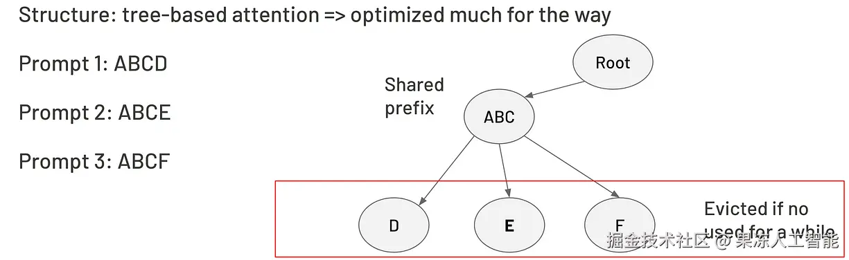 Raddix tree KV缓存是一种能让不同推理请求之间高效复用KV缓存的技术,特别适合多个请求有相同前缀的场景。把KV缓存组织成radix树的结构,可以让我们高效地回调KV数据,并且在多个请求间轻松共享。比如下面这个例子,三个请求共享了“ABC”这个前缀,这部分存在父节点里,最后每个请求的最后一个词则分配到三个叶子节点上。记住:用树结构操作的复杂度是O(nlogn),而不是注意力机制里的O(n²)。
