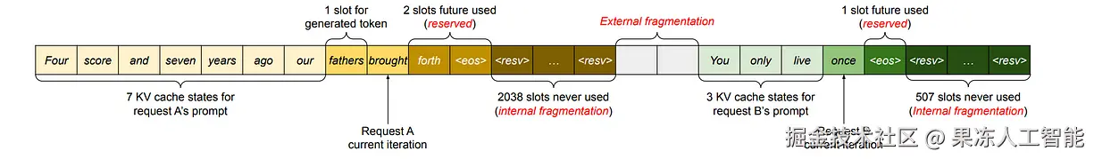 图里是一个7个词的提示:“four, score, and, seven, years, ago, our.” 填满了2048个slot中的前7个。后面模型生成了4个词:“fathers, brought, forth, ” —— 总共才用掉11个slot,剩下的2038个都空着。就这样,内存碎片就出来了。