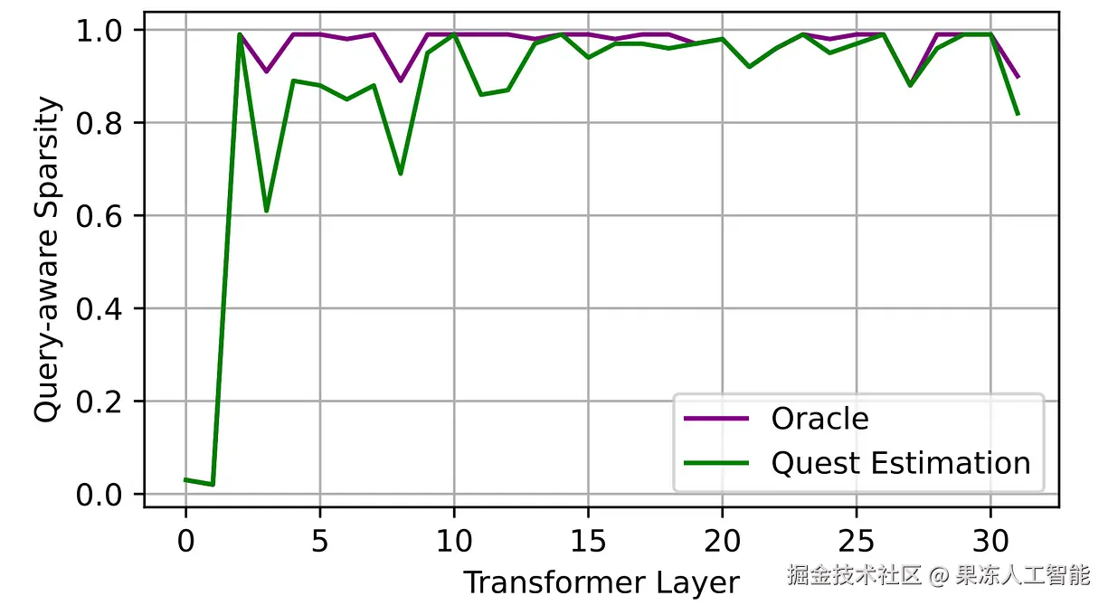 根据MIT的研究人员发表的论文《QUEST: Query-Aware Sparsity for Efficient Long-Context LLM Inference》,我们知道,在推理过程中,Transformer层中注意力计算往往是高稀疏的。意思是:大模型在推理时,并不是所有神经节点都会激活。基于这个点,之前的剪枝技术就利用过类似的想法,让大模型运行得更有效。下面这张图展示了Transformer模型中各层的稀疏度统计。不幸的是,从第三层开始,大多数层都很稀疏,最严重时像第十层甚至100%稀疏。这个现象本质上就是你在做一堆“乘0”的无效运算。