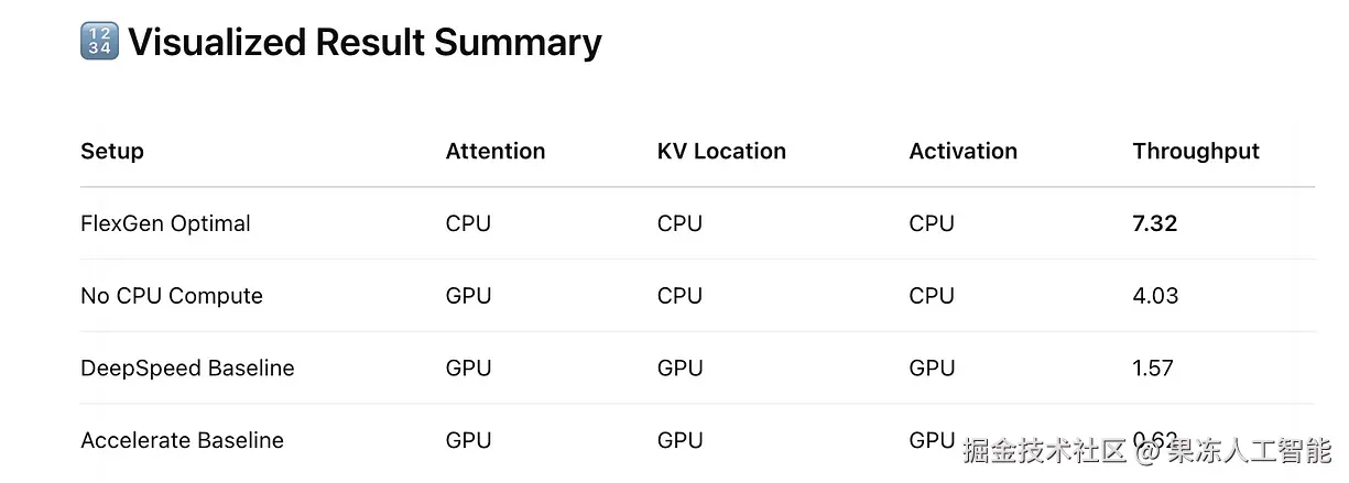 论文中拿 Flexgen 跟 DeepSpeed 和 HuggingFace 的 Accelerate 框架做了对比。Flexgen 的速度达到 7.32 tokens/s,而 DeepSpeed 是 1.57 tokens/s,Accelerate 只有 0.62 tokens/s。