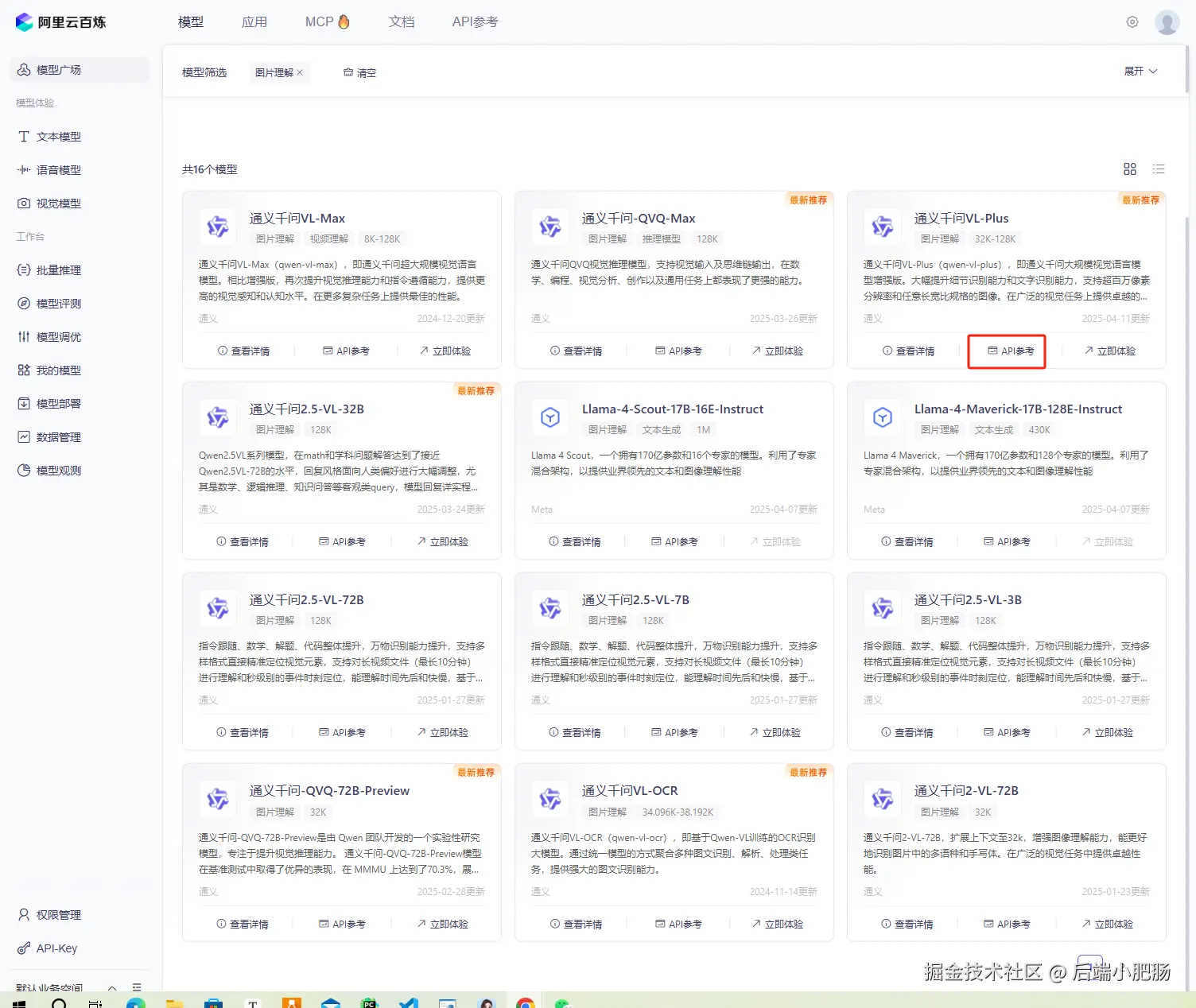 在进行图像识别插件的开发前,第一步是选择适合的基础模型。在阿里云百炼模型广场中(访问模型广场),可以找到各种类型的大模型,这些模型根据不同的任务需求分类,包括图像理解、文本生成、语音识别等。对于本次任务,我选择了支持图像内容理解的 qwen-vl-plus 模型。