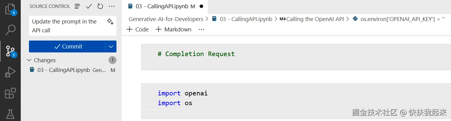 请记住,微软已经在 Copilot 中添加了一项创建 PR 描述的功能。它叫做 "生成的提交信息"(Generated Commit Message)。要使用该功能,你需要确保与 GitHub 上的仓库建立了连接。然后只需单击闪耀按钮,如图 。