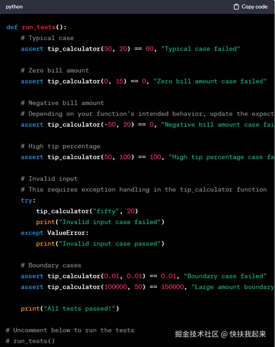 对于这样的代码,单元测试可以检查各种情况。例如,单元测试可以帮助验证函数是否能在一定范围内正确计算包括小费在内的总金额。这一点很重要,因为即使是很小的错误也会导致很大的差异。单元测试可涵盖典型情况,如标准账单金额和小费百分比,以及边缘情况,如账单金额为零或负或小费百分比异常高。单元测试还有助于确保函数能从容应对非数字或空值等异常输入。