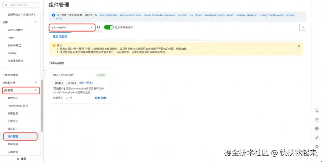 另一种无感的使用方式是使用 ARMS 提供的 ack-onepilot 组件,首先在阿里云 ACK 的运维管理界面点击组件管理,并且在右上角通过关键字搜索 ack-onepilot 组件,并在卡片上点击安装。