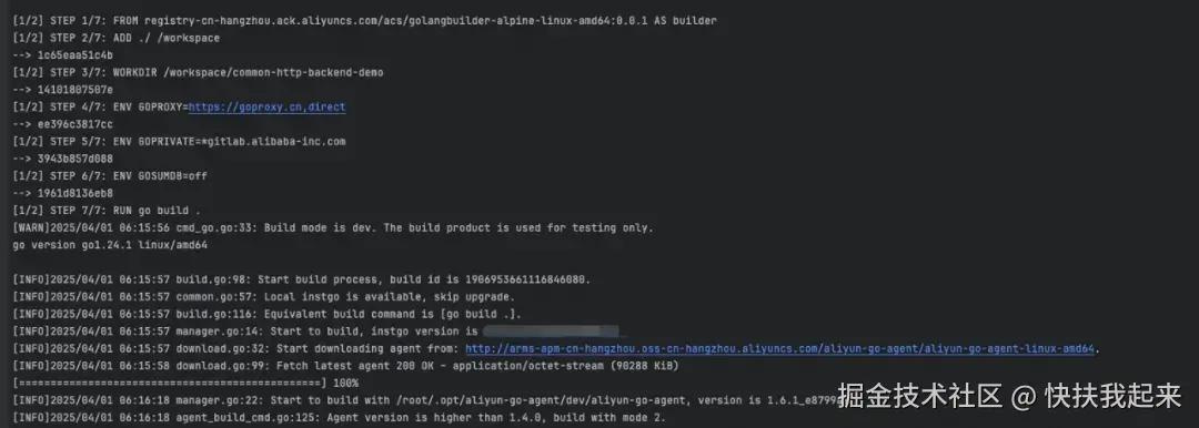 只需要把编译阶段的基础镜像替换为 ARMS 的编译镜像,其余的内容保持一致即可自动使用 ARMS 的 instgo 编译工具【3】进行混合编译,用户可以使用 docker build 命令构建该 Dockerfile 对应的镜像: