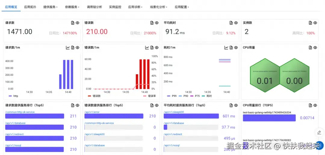 加上相关标签后,在 ARMS 控制台上即可查看到对应 Golang 应用,点击应用进入详情页即可查看该应用详细的观测数据。