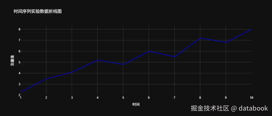 假设我们有一组时间序列的实验数据,记录了不同时间点的测量值。我们将使用Plotly绘制折线图来展示这些数据的变化趋势。