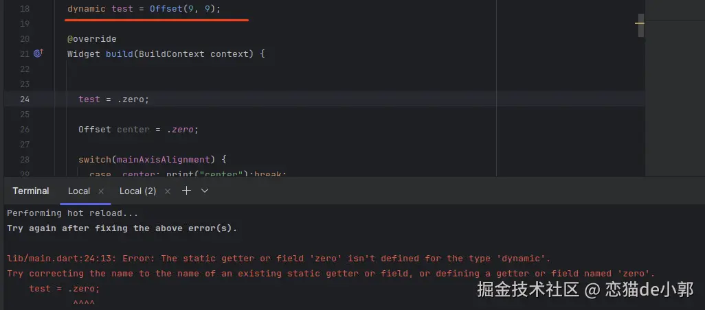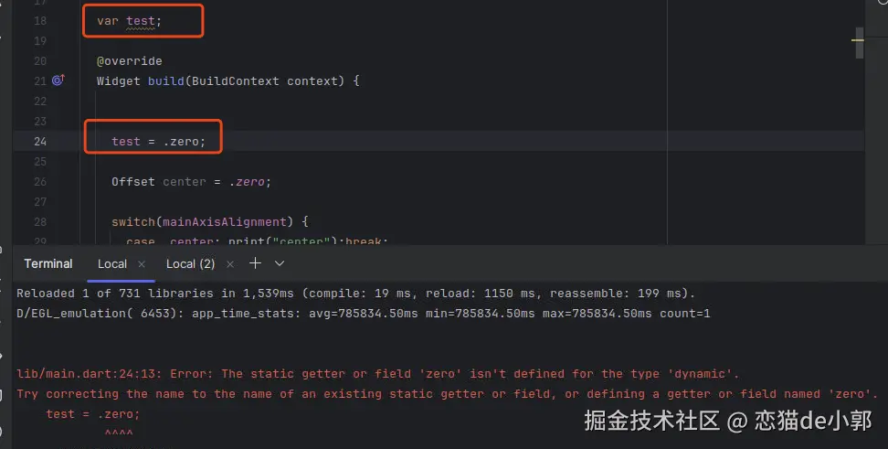 当然,既然说了是类型推断,那么 dynamic 肯定是不行,比如此时的 test 根本无法推断出其类型: