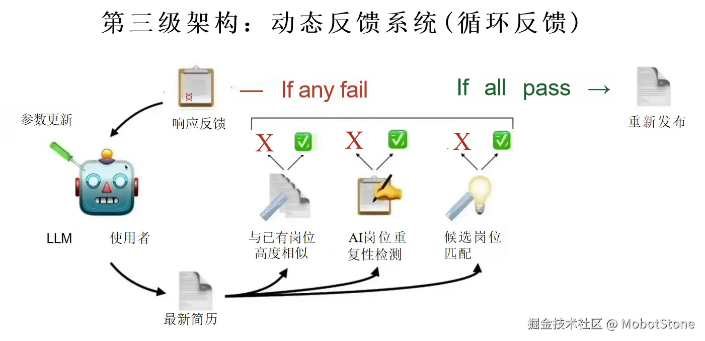 典型的实现方式是一个**"行动+反馈"循环**:系统反复执行任务并接收评估信号,直到达成预定目标。例如AI求职助手,让LLM生成求职简历,然后通过评分系统对岗位和简历匹配度进行质量检测(反馈),直至结果达标。