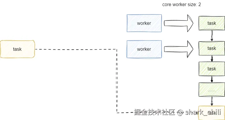addWorker创建线程并执行我们传入的任务。 - 如果核心线程都在工作,则调用