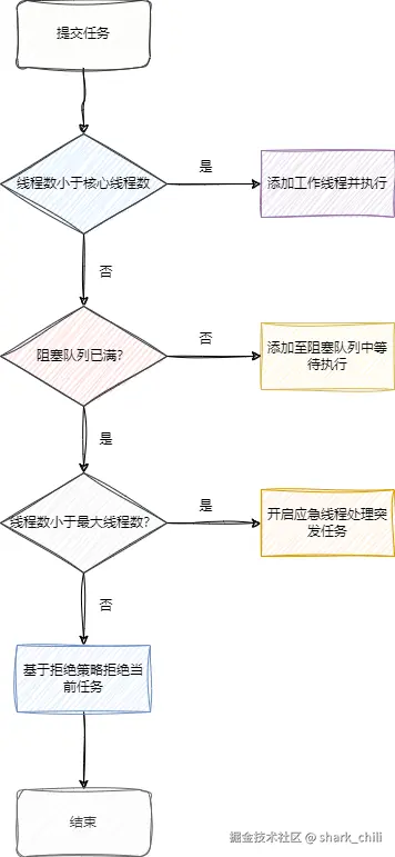 workQueue.offer(command)将我们提交的任务放到队列中。 - 如果队列也无法容纳任务时,则继续创建线程并用这些线程处理新进来的任务。