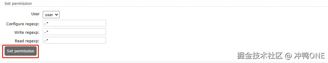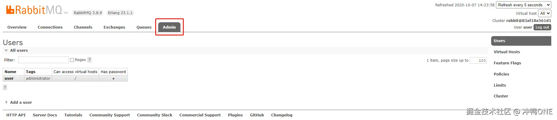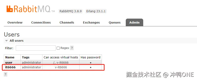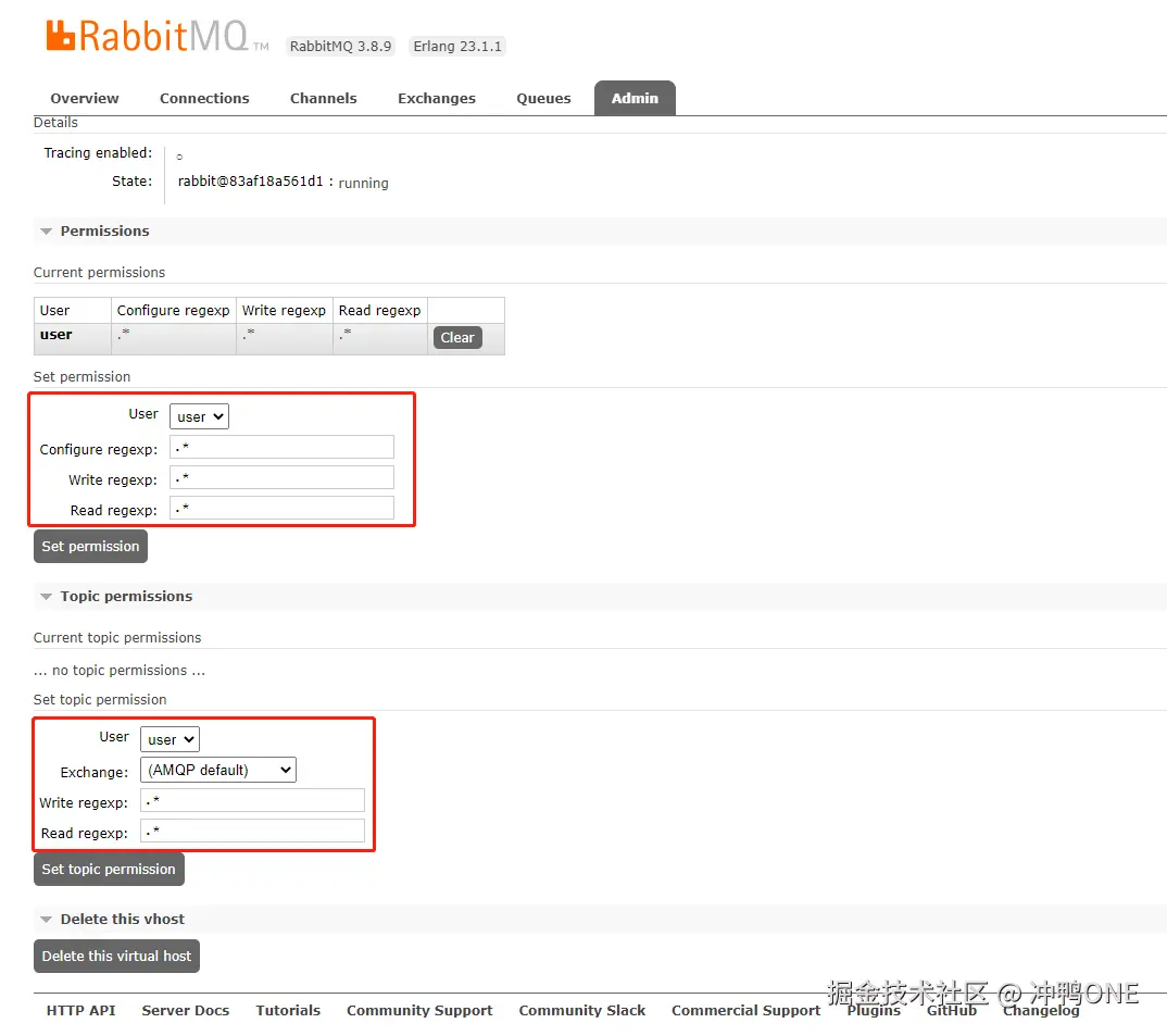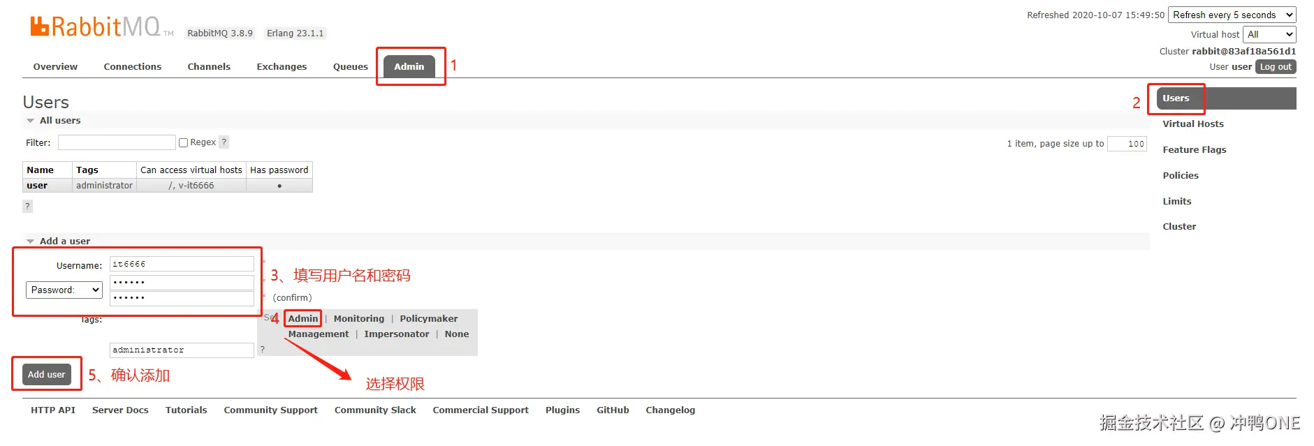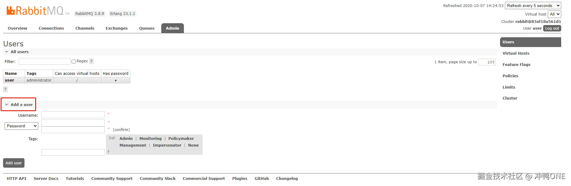 Tags选项,其实是指定用户的角色,可选的有以下几个:超级管理员(administrator) 可登陆管理控制台,可查看所有的信息,并且可以对用户,策略(policy)进行操作 监控者(monitoring) 可登陆管理控制台,同时可以查看 RabbitMQ 节点的相关信息(进程数,内存使 用情况,磁盘使用情况等) 策略制定者(policymaker) 可登陆管理控制台, 同时可以对 policy 进行管理。但无法查看节点的相关信息 普通管理者(management) 仅可登陆管理控制台,无法看到节点信息,也无法对策略进行管理 其他:无法登陆管理控制台,通常就是普通的生产者和消费者