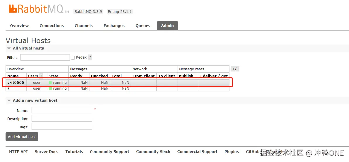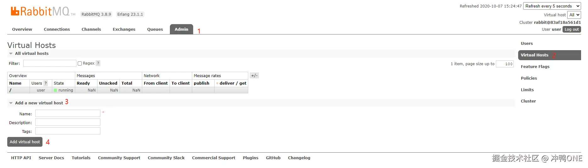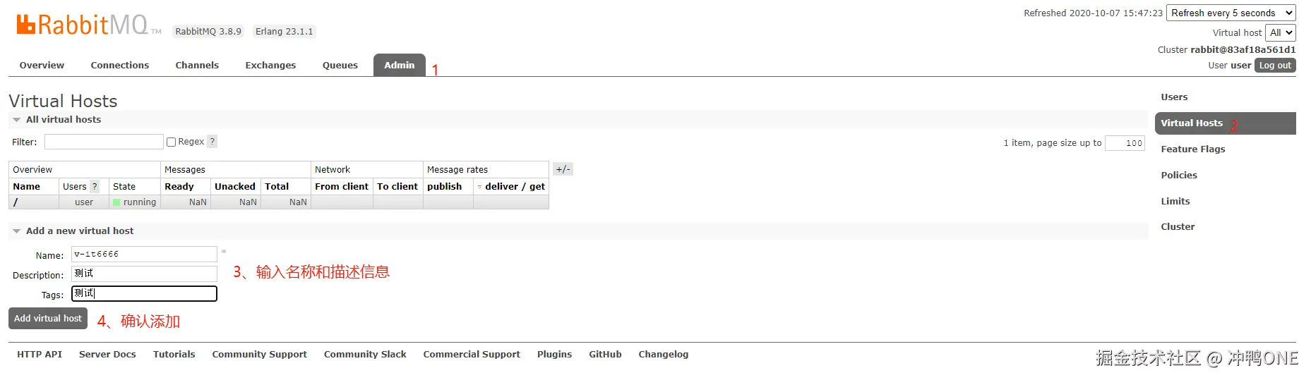 为了让各个用户可以互不干扰的工作,RabbitMQ 添加了虚拟主机(Virtual Hosts)的概念 其实就是一个独立的访问路径,不同用户使用不同路径,各自有自己的队列、交换机,互相不会影响对方 如下图中的步骤创建即可,填写好相关的