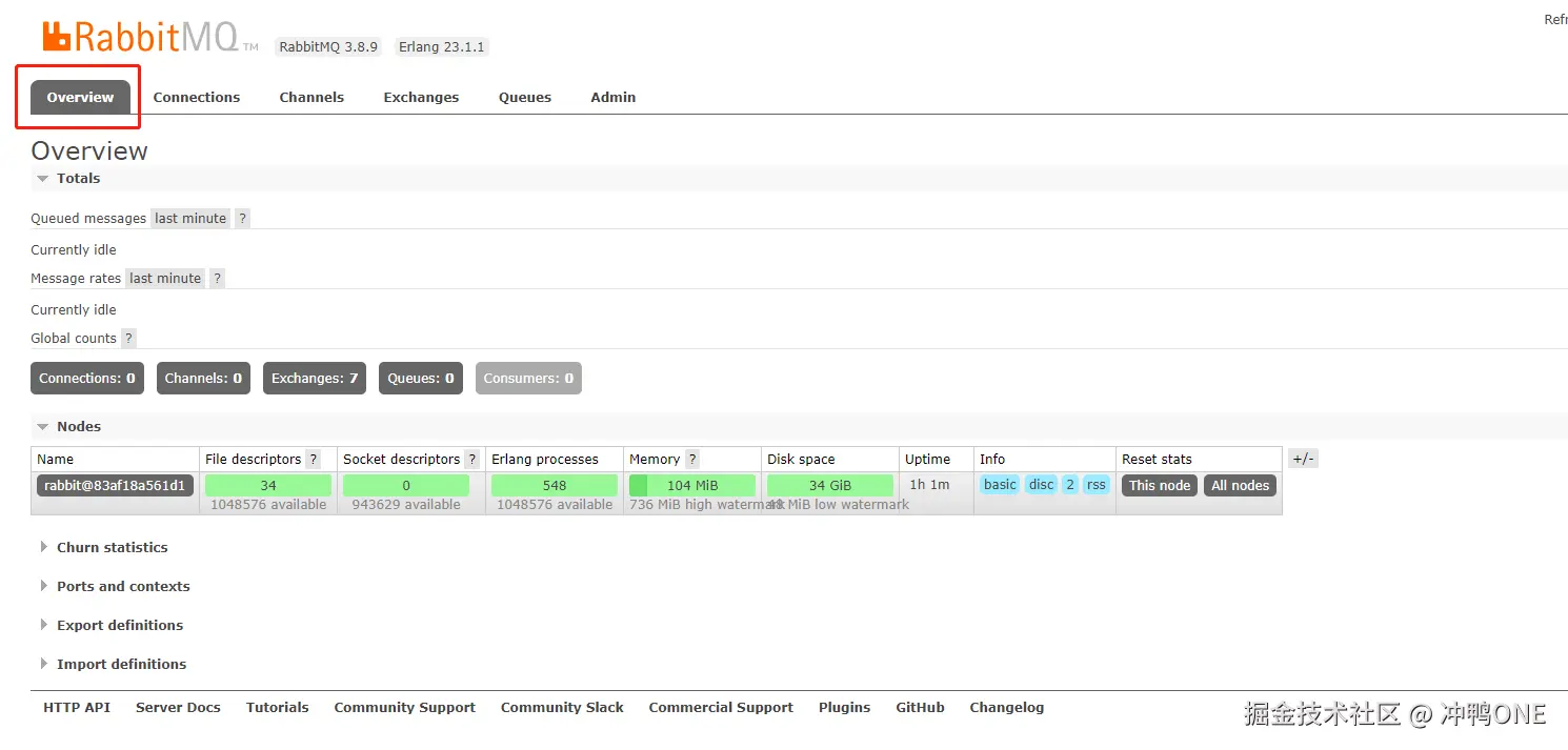 connections:无论生产者还是消费者,都需要与 RabbitMQ 建立连接后才可以完成消息的生产和消费,在这里可以查看连接情况channels:通道,建立连接后,会形成通道,消息的投递获取依赖的通道Exchanges:交换机,用来实现消息的路由Queues:队列,就是消息队列,消息存放在队列中,等待消费,消费后会被移除队列