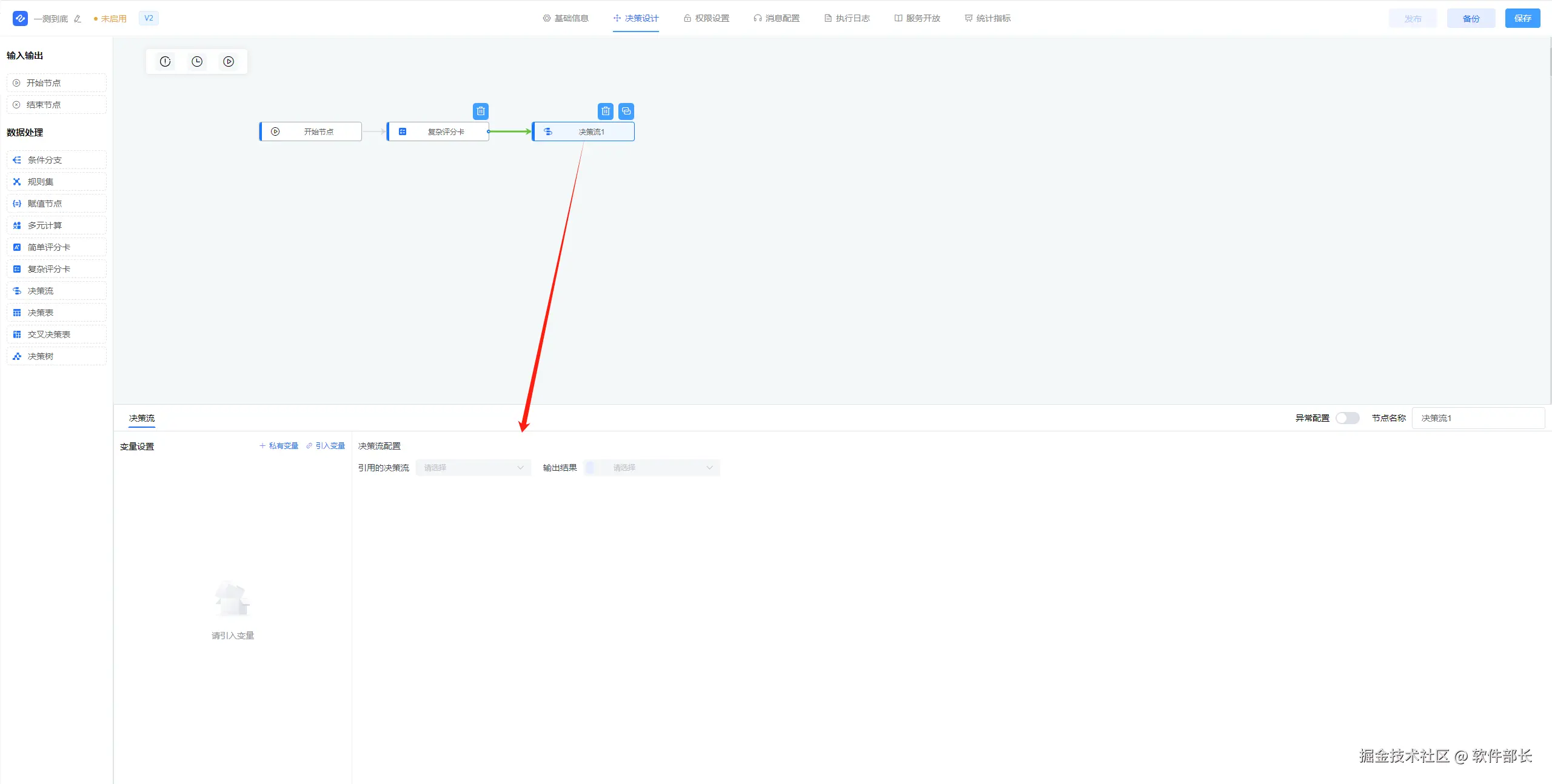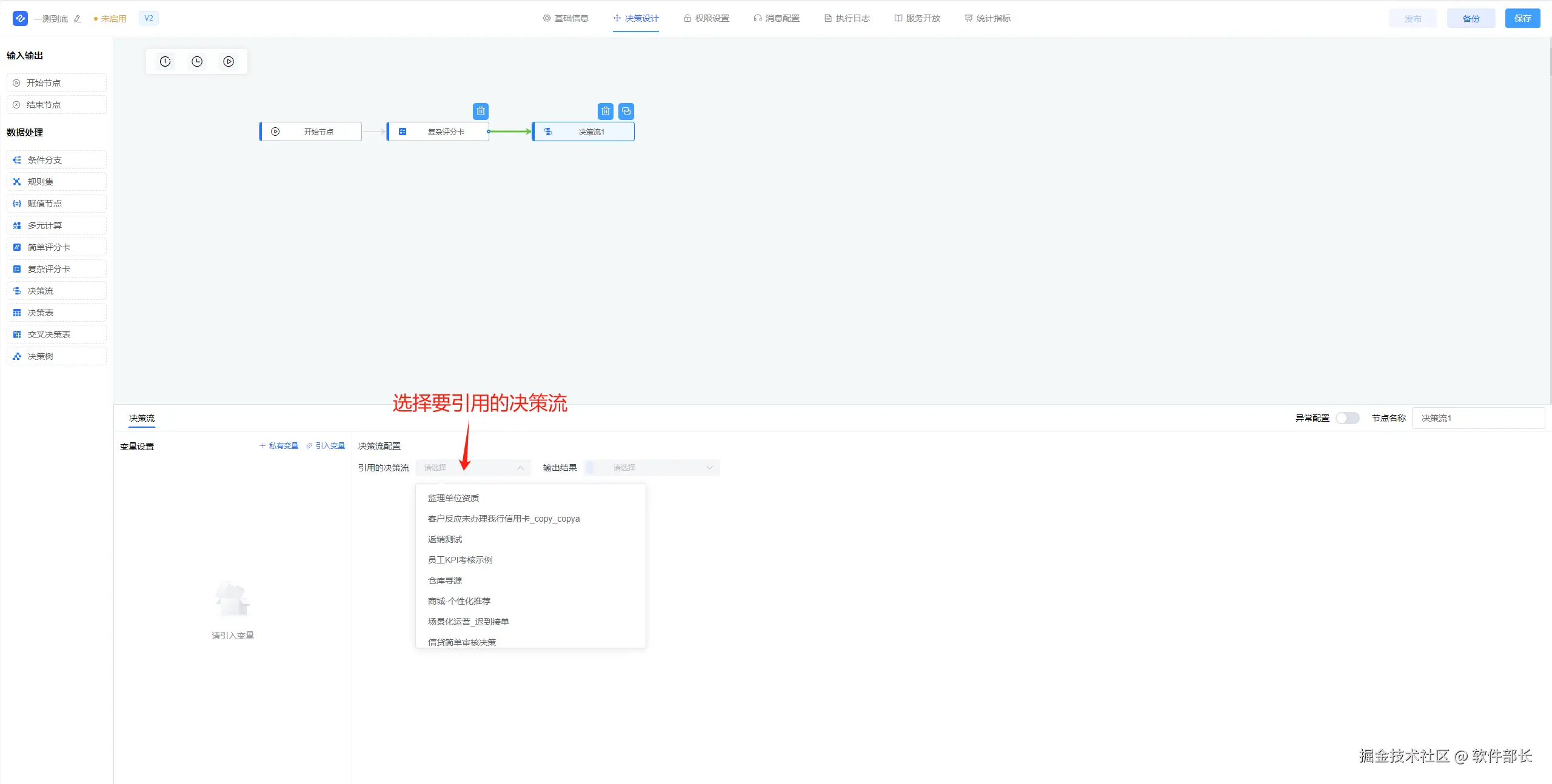 将其他复杂的决策流,通过直接选择即可引用到配置的决策中。 - 可视化编排
