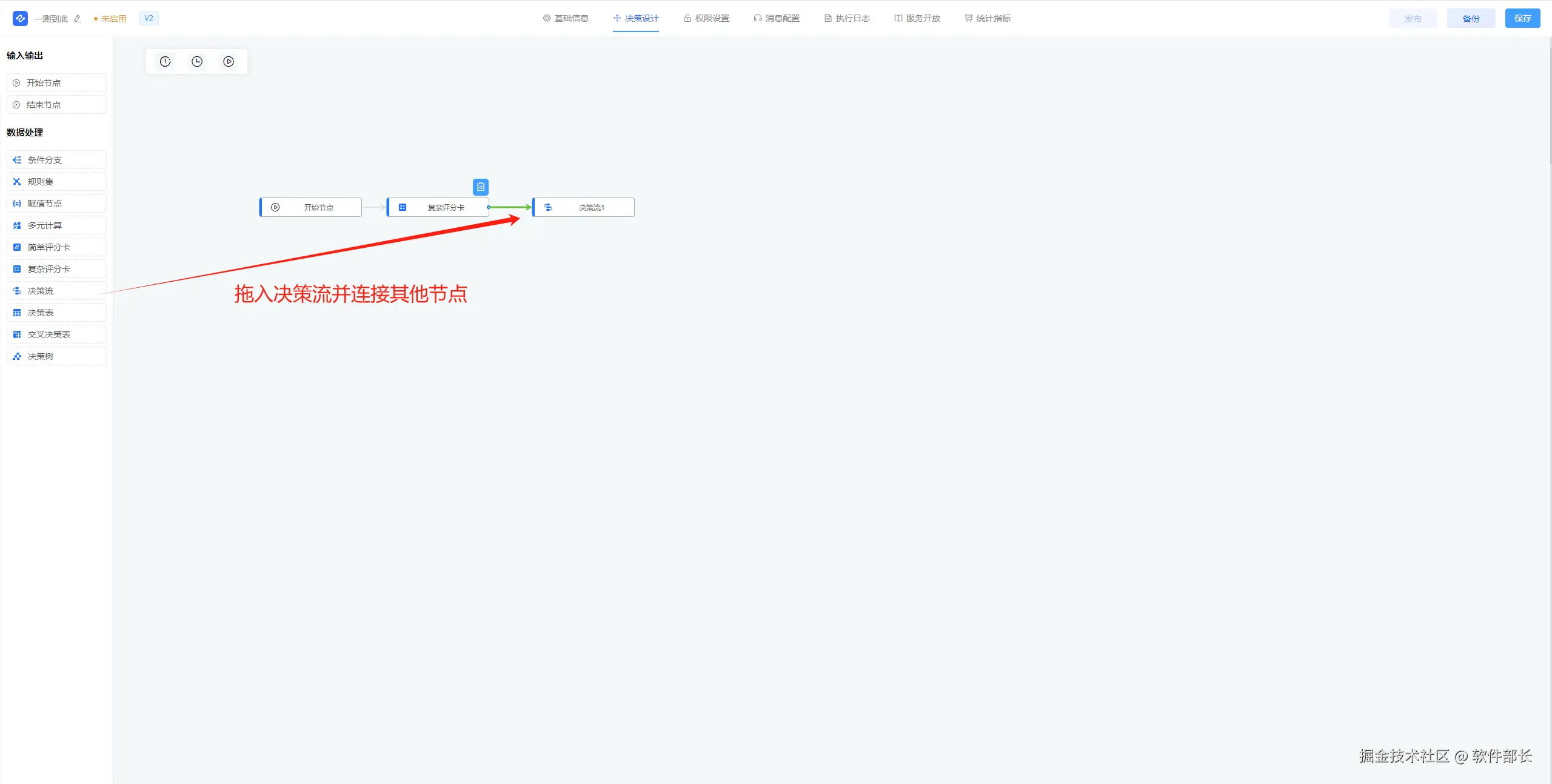 1、拖入决策流节点,连接决策流开始节点或者上游节点