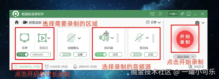 步骤2:在 “屏幕录制” 模式界面上,选择好需要录制的屏幕区域和音频源。还可以开启 “按时长录制” 功能。全部设置好了之后,点击 “开始录制” 就能够录制视频了。