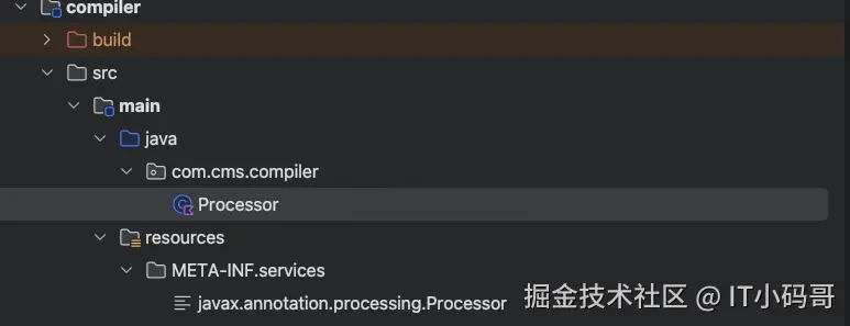 首先创建一个 java 类 Processor,继承于AbstractProcessor(),实现其中方法。然后在 compiler 模块的 main 目录下,创建 resources 资源目录,然后在创建 META-INF.services 目录。这里要注册 META-INF.services 是文件夹的名称,并不是文件名称。