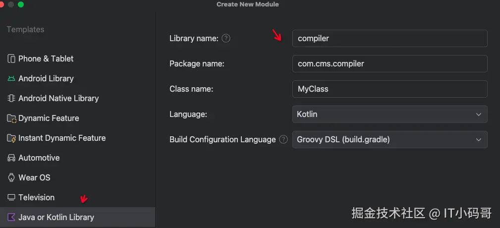 - 创建一个模块名为compiler 的 java 类型的 module。注意这里一定是 java 类型,语言选 java 或 kotlin 都可以,可以根据自身情况选择。创建完 module 后,就可以开始注册了。这里分别使用两种不同的方式进行注册。