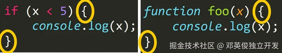 使用大括号 {} 来给相同的代码块